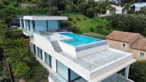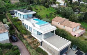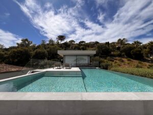 In eerste lijn aan de stranden van Sainte Maxime. De moderne villa werd trapsgewijs ingewerkt in het sterk hellend terrein. De woning trekt zich op tegen de bergflank om zo per niveau meer en meer ruimte te creëren. Het top down ontwerp draait de klassieke leefpatronen om: leven op de bovenste verdiepingen, nutsfuncties onderaan. Een ruim dakterras, met infinity pool en adembenemend zeezicht, sluit aan bij de leefzone. Grote raampartijen met maximale beglazing brengen deze buitenbeleving tot diep in de woning. Hoewel het ontwerp niet van onze hand is past het perfect binnen onze architecturale visie. Wij werden ingeschakeld voor de technische uitwerking en de realisatie.